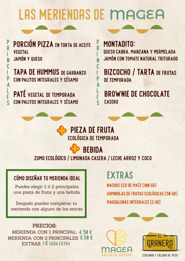 - Merienda: La familia organizadora será la encargada de facilitar la merienda siguiendo las medidas de seguridad indicadas en el protocolo que se entregará. Os dejamos él menú que nos facilitan desde el GRANERO para que podáis pasar a por el si queréis contratar este servicio de merienda.
