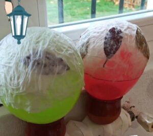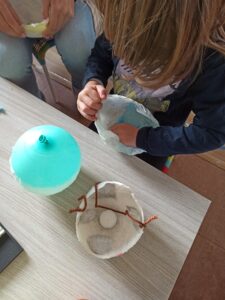 - Los vasos de cuajada nos permitieron dejarlos secando encima de los radiadores para acelerar el proceso. Una vez secos, pinchamos el globo y lo retiramos.